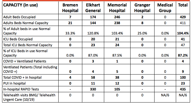 Elkhart General Hospital has opened additional rooms and is accommodating patients needing care. Memorial Hospital of South Bend has exceeded its ability to expand further and care for all patients presenting, and went on adult diversion to ambulances today.