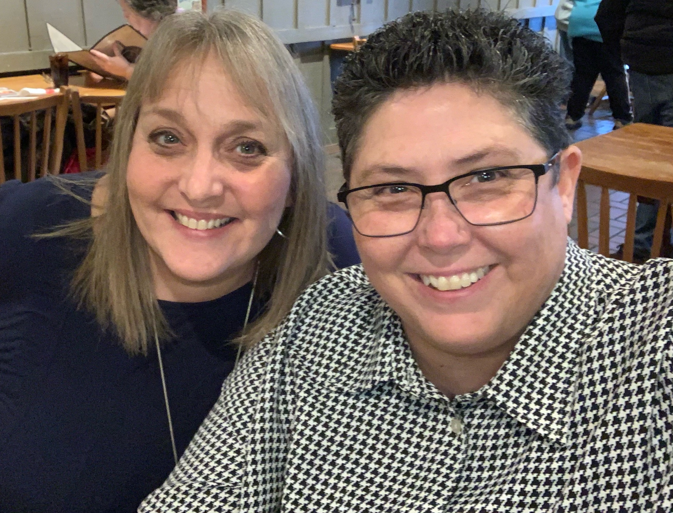 Tami and her mom pose for a photo after Tami received the COVID-19 vaccine.