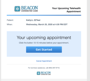 Your Beacon healthcare provider has offered you an online visit using Beacon Connected Care. Shortly, you should be receiving an email from us. If you have not received your email within 24 hours, please check your junk mail or spam folder. Your email will include the following: