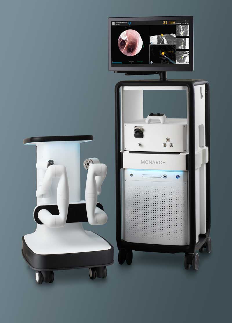 Used to view the inside of the lungs and obtain a tissue sample for biopsy, the goal of a MONARCH® robotic bronchoscopy is to enable earlier and more accurate diagnosis of small and hard-to-reach nodules in the periphery of the lung.
