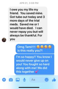 “I owe you my life my friend. You saved mine. Got tube out today and three more days of the trial meds. (You) saved me or I would have died. I can never repay you but will always be thankful for you.”