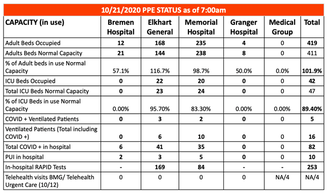 Elkhart General Hospital has 41 COVID-positive patients in-house, with an overall patient census of 189.