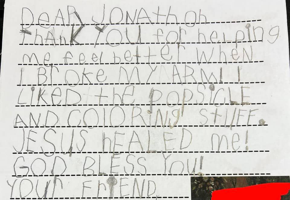 Dear Jonathon, Thank you for helping me feel better when I broke my arm.
