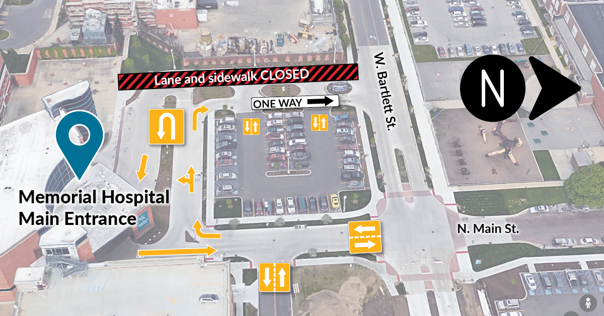 Traffic patterns around Memorial Hospital’s main entrance will change beginning Thursday, June 2, due to work to expand the hospital’s energy center. The main entrance will remain open, and patients can be dropped off or picked up curbside. Barricades and signage will be in place to help guide patients, visitors and pedestrians.
