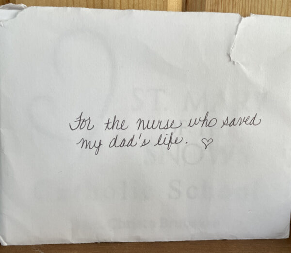 The envelope holding Christa Brubaker’s note to Beacon nurse Lauren Huyvaert.