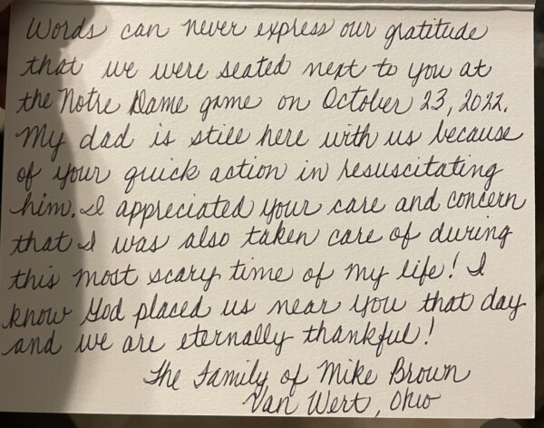 Words can never express our gratitude that we were seated next to you at the Notre Dame game on Oct. 23, 2022. My dad is still here with us because of your quick action in resuscitating him. I appreciated your care and concern that I was also taken care of during this most scary time of my life. I know God placed us near you that day and we are eternally thankful.
