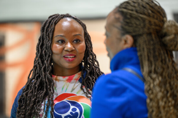 Dr. Joyce Adams speaks with Kimberly Green Reeves at the Pop Up Village. (Photo by Matt Cashore/University of Notre Dame)