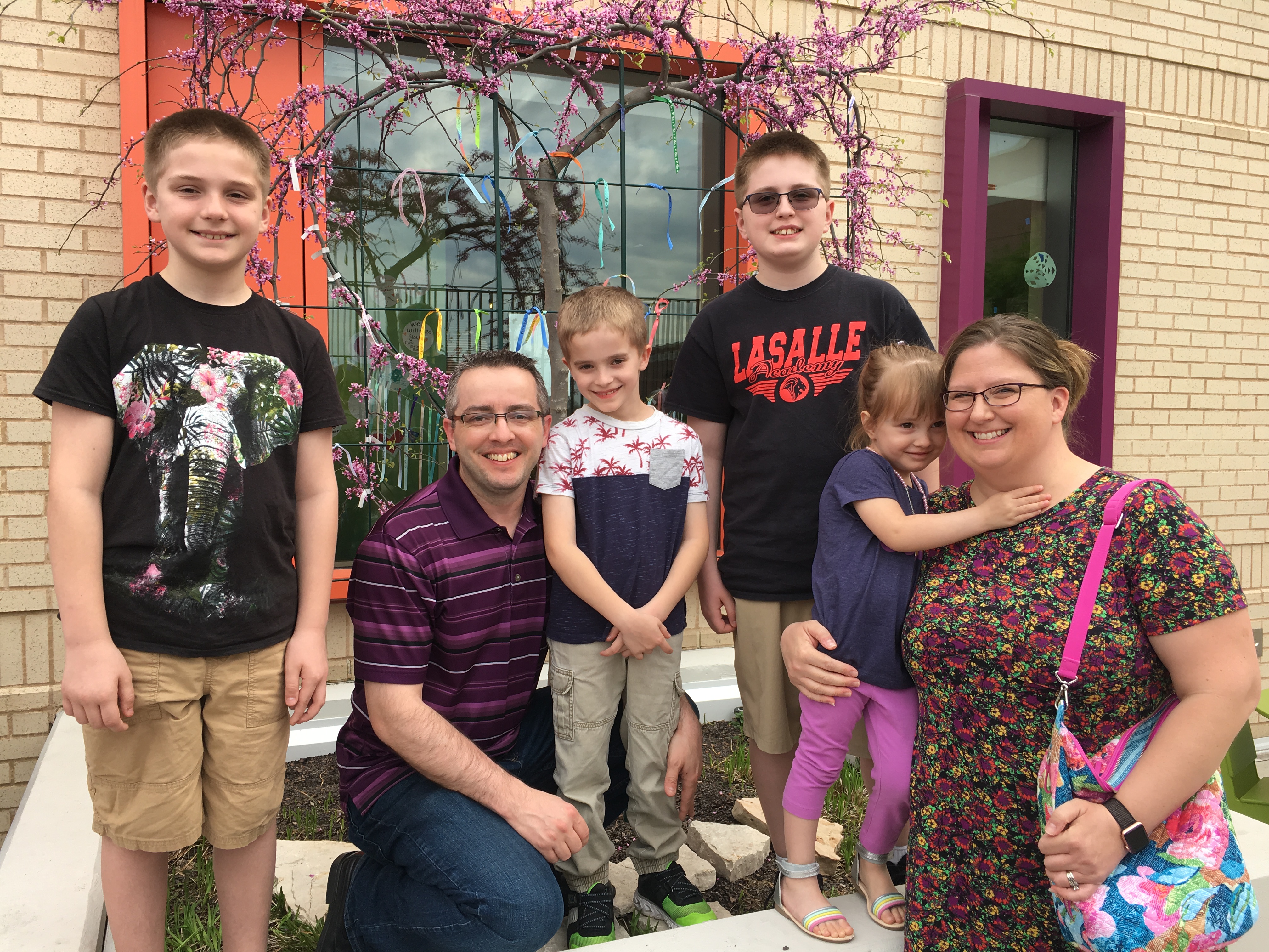 Colorful ribbons hang from a redbud tree that is planted on the patio of the Beacon Children's NICU. The branches of this tree, which are attached to a heart-shaped frame, contain the names of babies who have been cared for Beacon Children's Hospital team.
