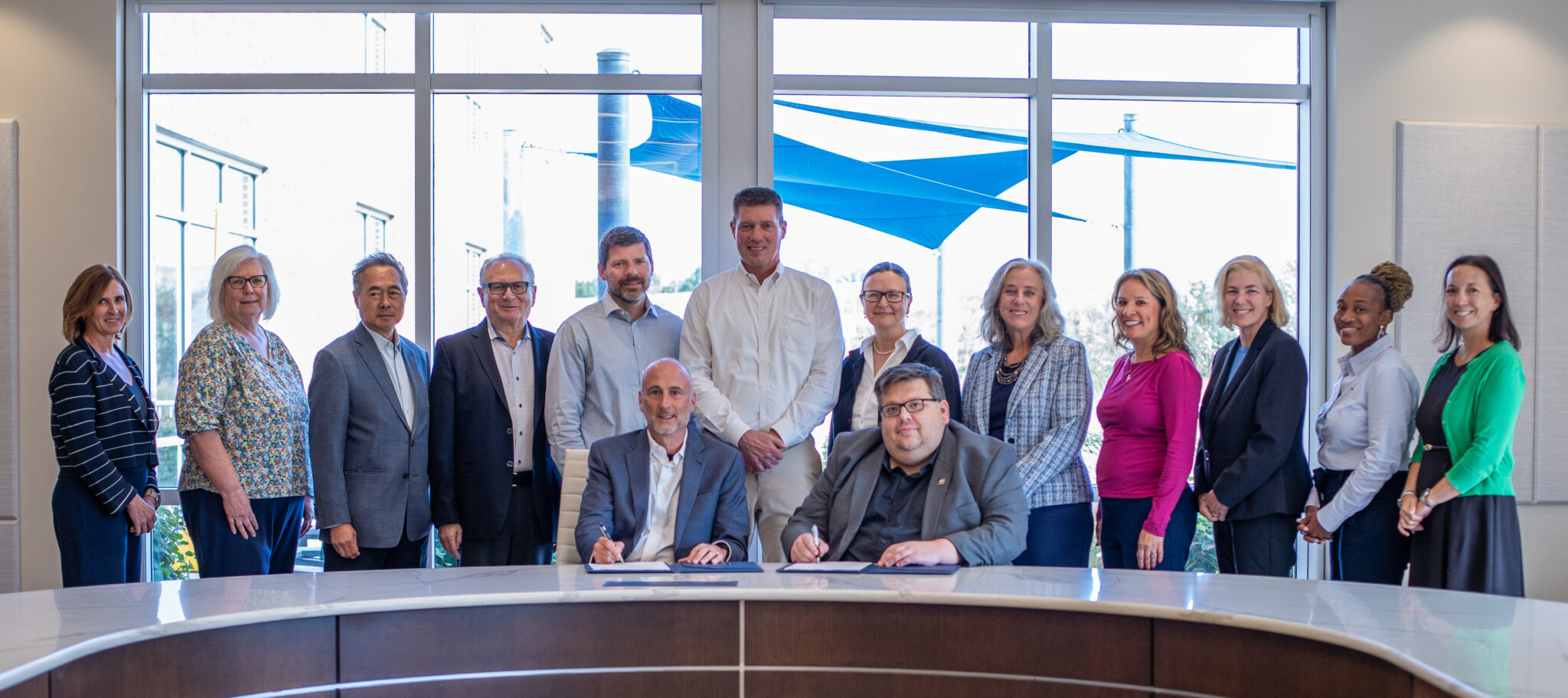 Back row, Left to Right: Susan King, President, Beacon Health Foundation, Melanie DeFord, Assistant Vice President for Research, Notre Dame, S. Jesse Hsieh, MD, Haysam El-Dalati, MD, ABTS, MBA, Chief Clinical Officer, Beacon Health System, Jason Stabnik, Vice President Cancer Services, Beacon Health System, Kreg Gruber, Chief Executive Officer, Beacon Health System, Patricia Clark, Associate Vice President for Research; O’Hara Professor of Chemistry & Biochemistry; Director, Biophysics Instrumentation Core Facility, Notre Dame, M. Sharon Stack, Ann F. Dunne and Elizabeth Riley Director, Harper Cancer Research Institute; Kleiderer-Pezold Professor of Biochemistry, Notre Dame, Jessica Brookshire, Director, Community Health and Clinical Partnerships, Kimberly Green Reeves, Vice President, Community Impact & Partnerships, Beacon Health System, Joanne Fahey, Executive Director, Research Communications, Marketing, and Events, Notre Dame.